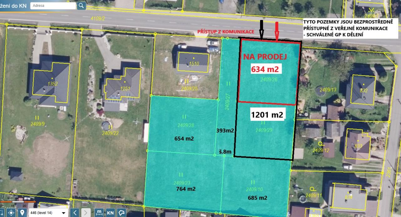 Jsme na FacebookuProdám stavební pozemek p.č. 2409/26 v Kozlovicích o výměře 634 m2 nebo 2 pozemky p.č. 2409/26 a 2409/29 o celkové výměře 1201 m2. Oba pozemky jsou bezprostředně přístupné z veřejné komunikace (takto byl schválen GP k dělení pozemků) |