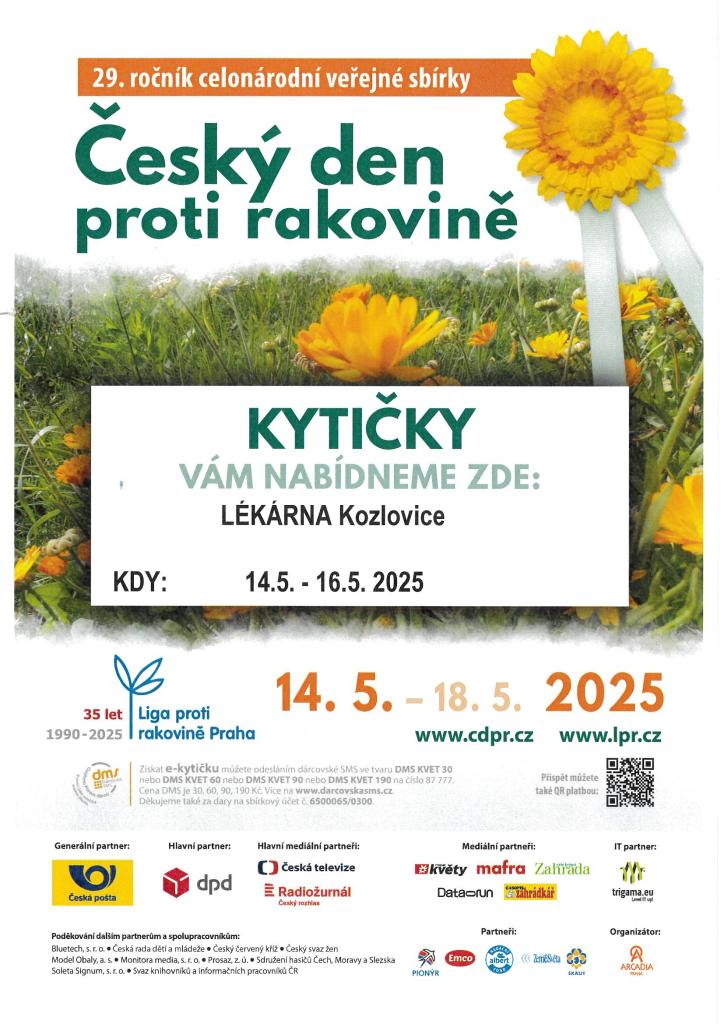 Jsme na FacebookuTaké v letošním roce se lékárna Kozlovice zapojila do prodeje žlutých kvítků, kterou pořádá Liga proti rakovině. Veřejná sbírka Český den proti rakovině proběhne v ulicích ve středu 14. května 2025, v kamenných obchodech až do 18. 5. 2025.