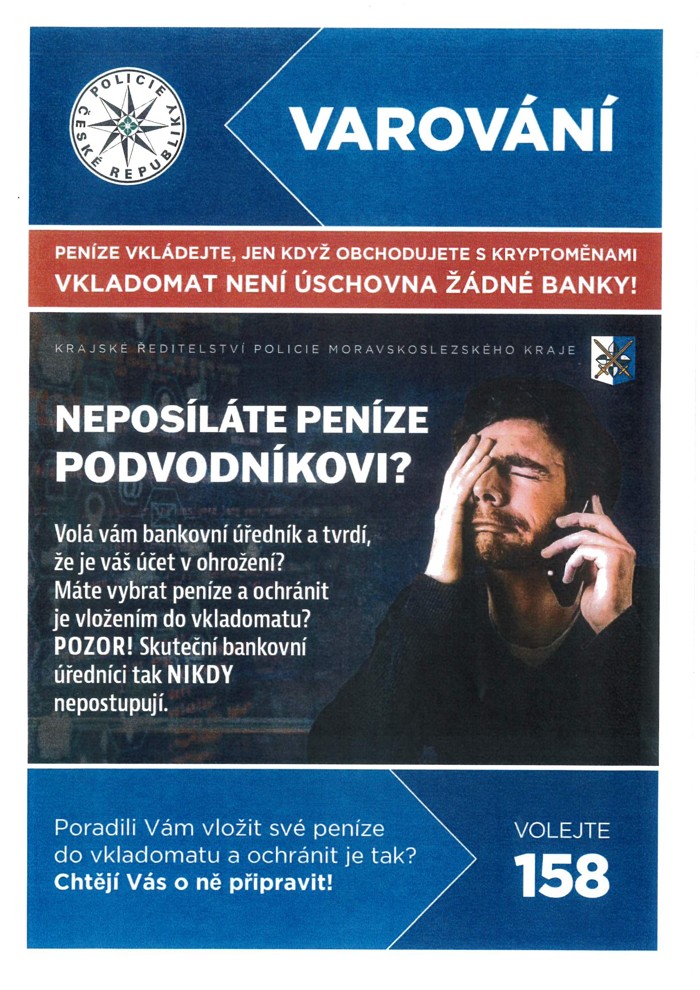Opět nabádáme veřejnost k obezřetnosti. Pokud vám volá pracovník banky a tvrdí, že je váš účet v ohrožení, kontaktujete telefonicky nebo osobně vaši banku. Ověřte si pravdivost informací nejen v bance ale také u všech institucí, za jejichž pracovníky se podvodníci vydávají. Kontakty si sami vyhledejte z veřejně dostupných zdrojů. Skuteční bankovní úředníci nikdy nepostupují tak, že by vás telefonicky naváděli k vybrání peněz z vašeho účtu a jejich vložení nebo zaslání jinam.