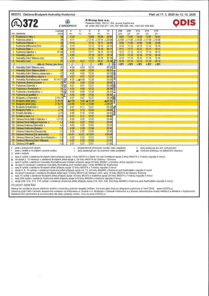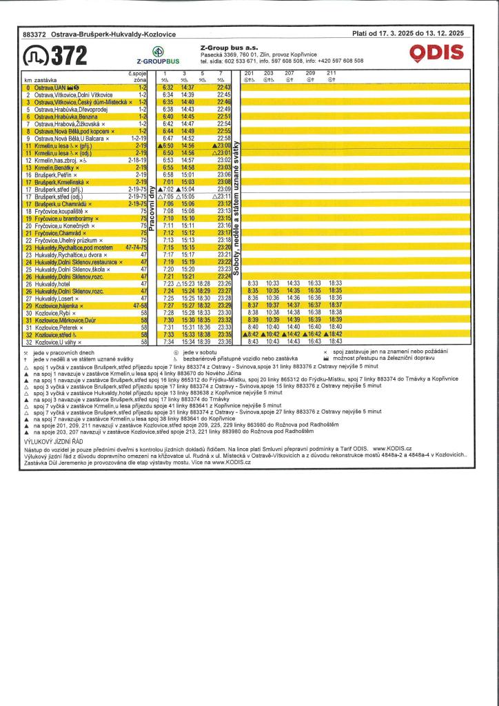 Jsme na FacebookuAutobusová linka 372 Ostrava - Brušperk – Hukvaldy - Kozlovice bude od 17. 3. 2025 vedena pouze v pracovní dny.