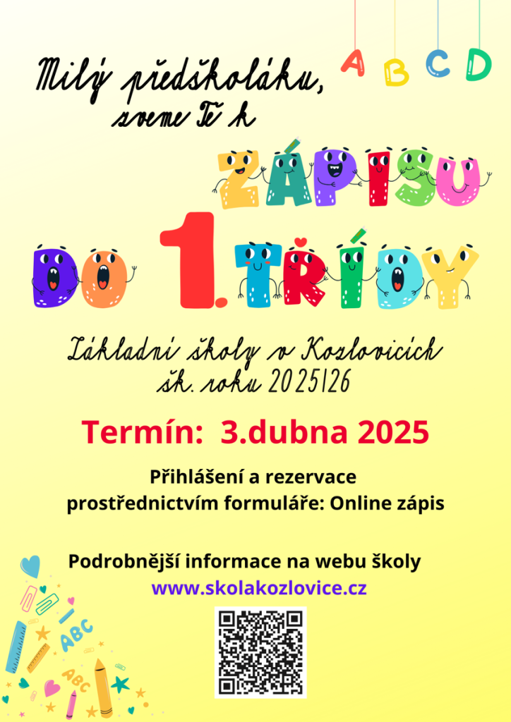 Pozvánka k zápisu předškoláků do 1. třídy ZŠ v Kozlovicích.
