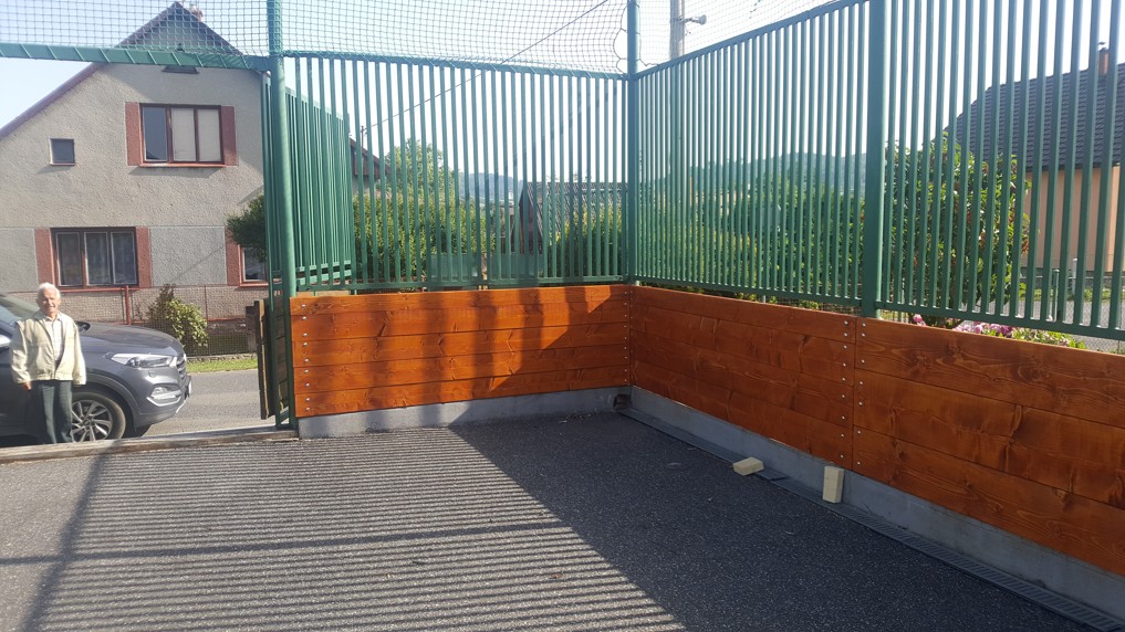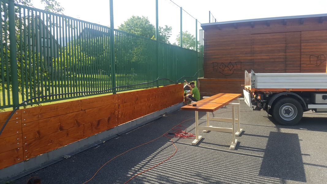 Na asfaltovém multifunkčním hřišti probíhá oprava – výměna dřevěných mantinelů.