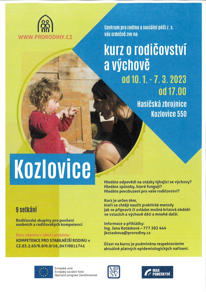 Kurz je pořádán v rámci projektu KOMPETENCE PRO STABILNĚJŠÍ RODINU II pro účastníky zdarma. Kapacita míst je omezena, proto s přihlášením neotálejte! Přihlášení možné ZDE