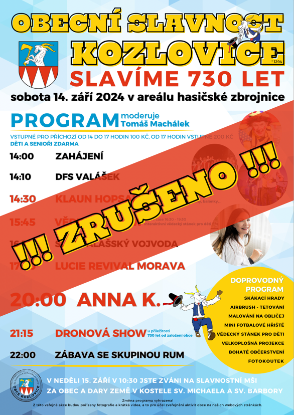 S politováním musíme oznámit, že vzhledem k velmi nepříznivým předpovědím počasí na tento víkend, musíme Obecní slavnost ZRUŠIT. Věřte, že nikoho to nemrzí více, než nás. Třičtvrtě roční práce, organizace a snažení přijde vniveč.