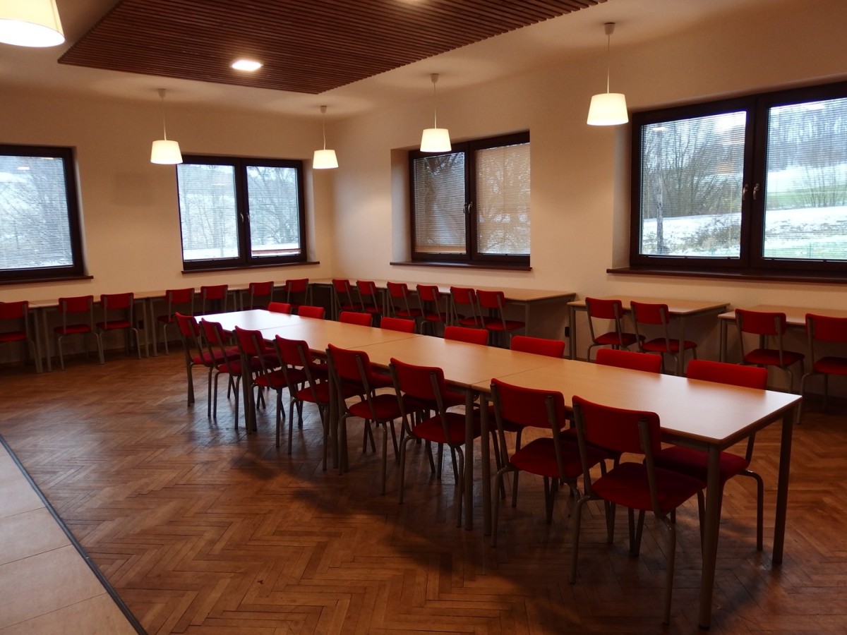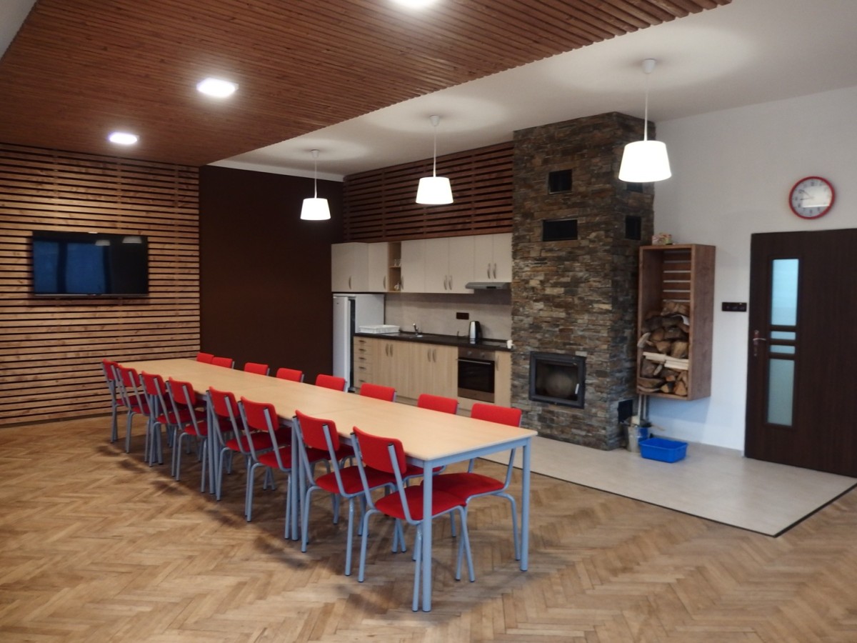 Z místnosti bývalé třídy je místnost společenská – vybavená TV, kuchyňskou linkou (varná deska, trouba), lednicí, nádobím a potřebným nábytkem pro 35 osob. Vytápění je prostřednictvím teplovzdušného krbu. Součástí objektu je sociální zařízení a dvě velké šatny se sprchami. Naproti budovy je hřiště. Rovněž je zde možné zaparkovat.